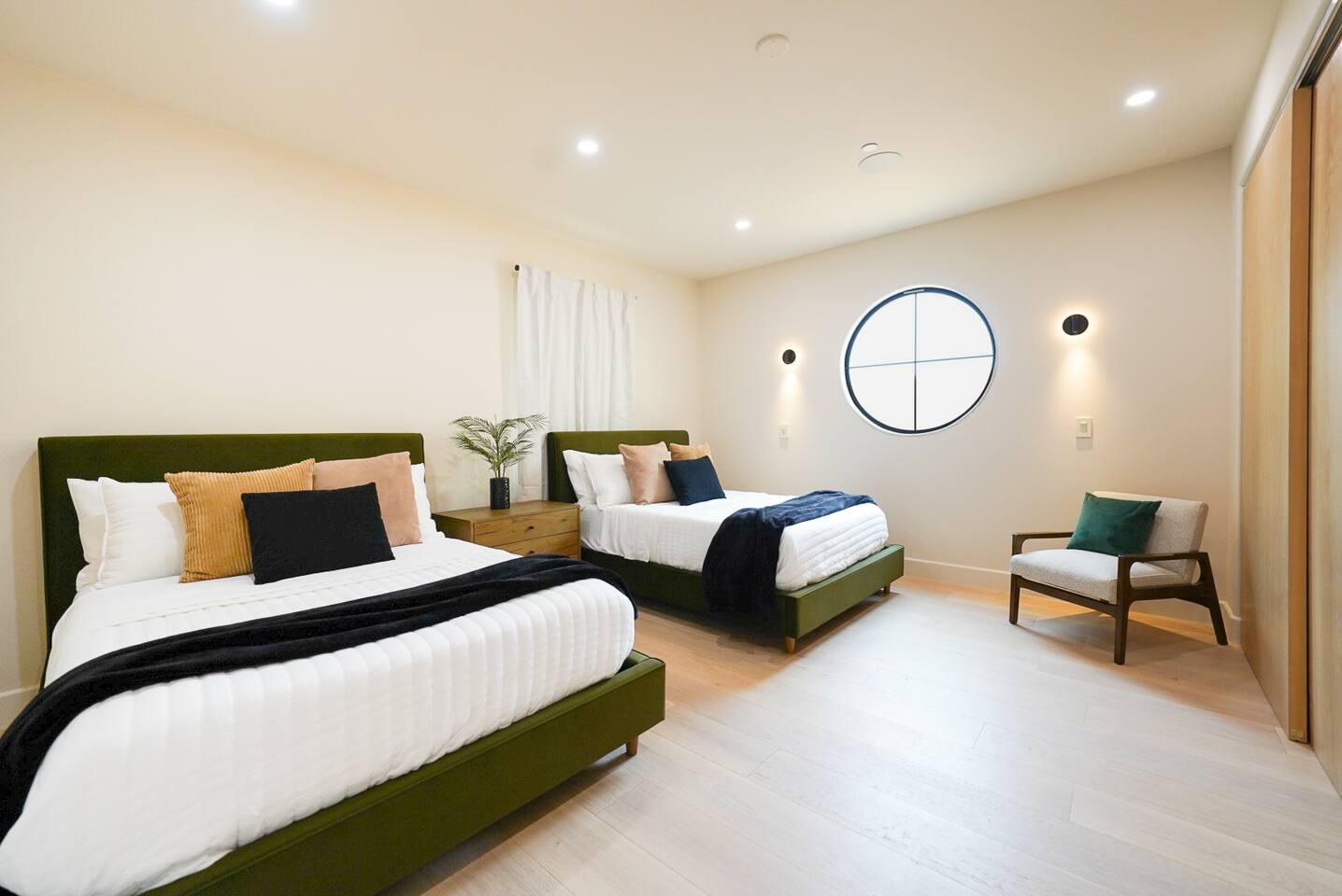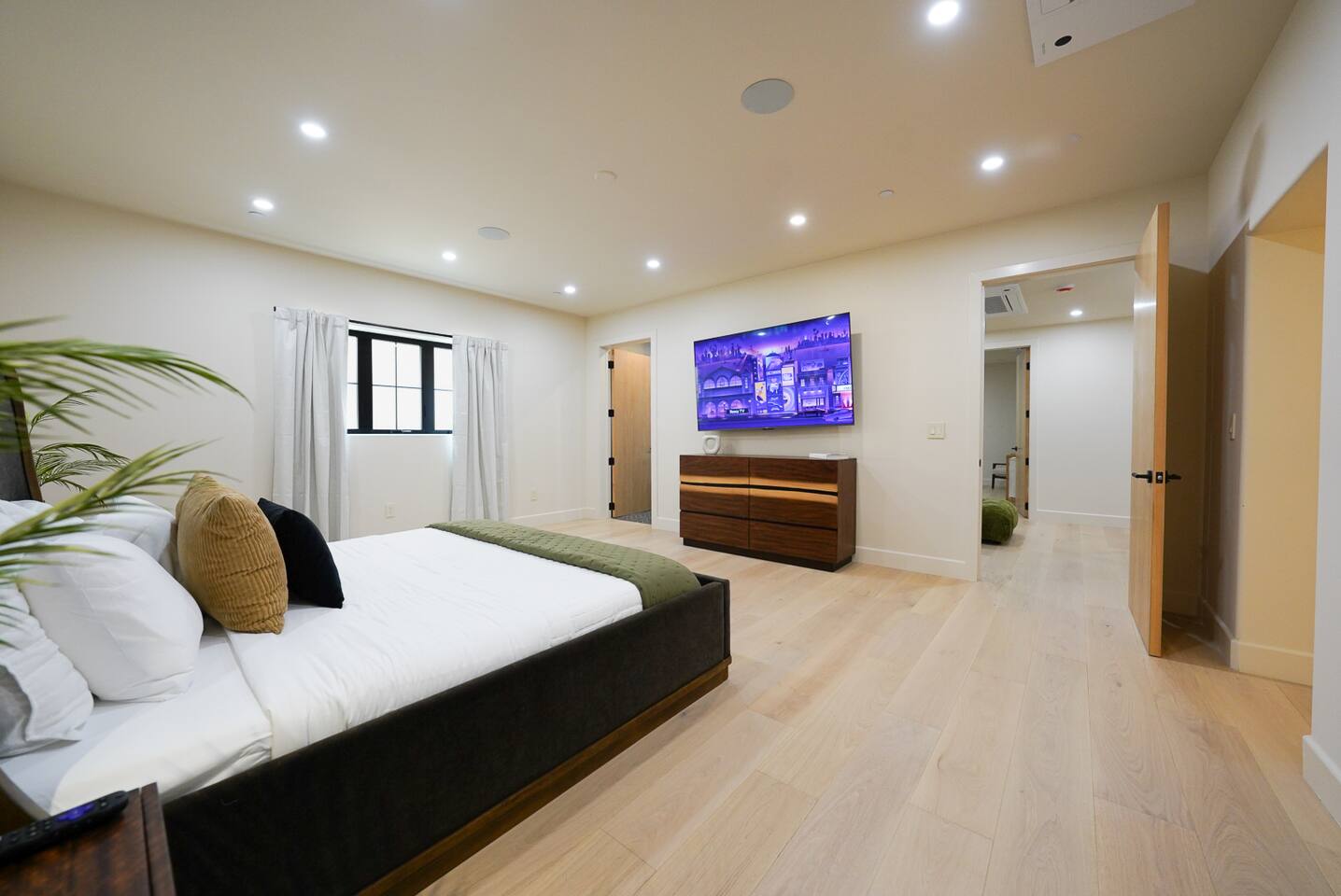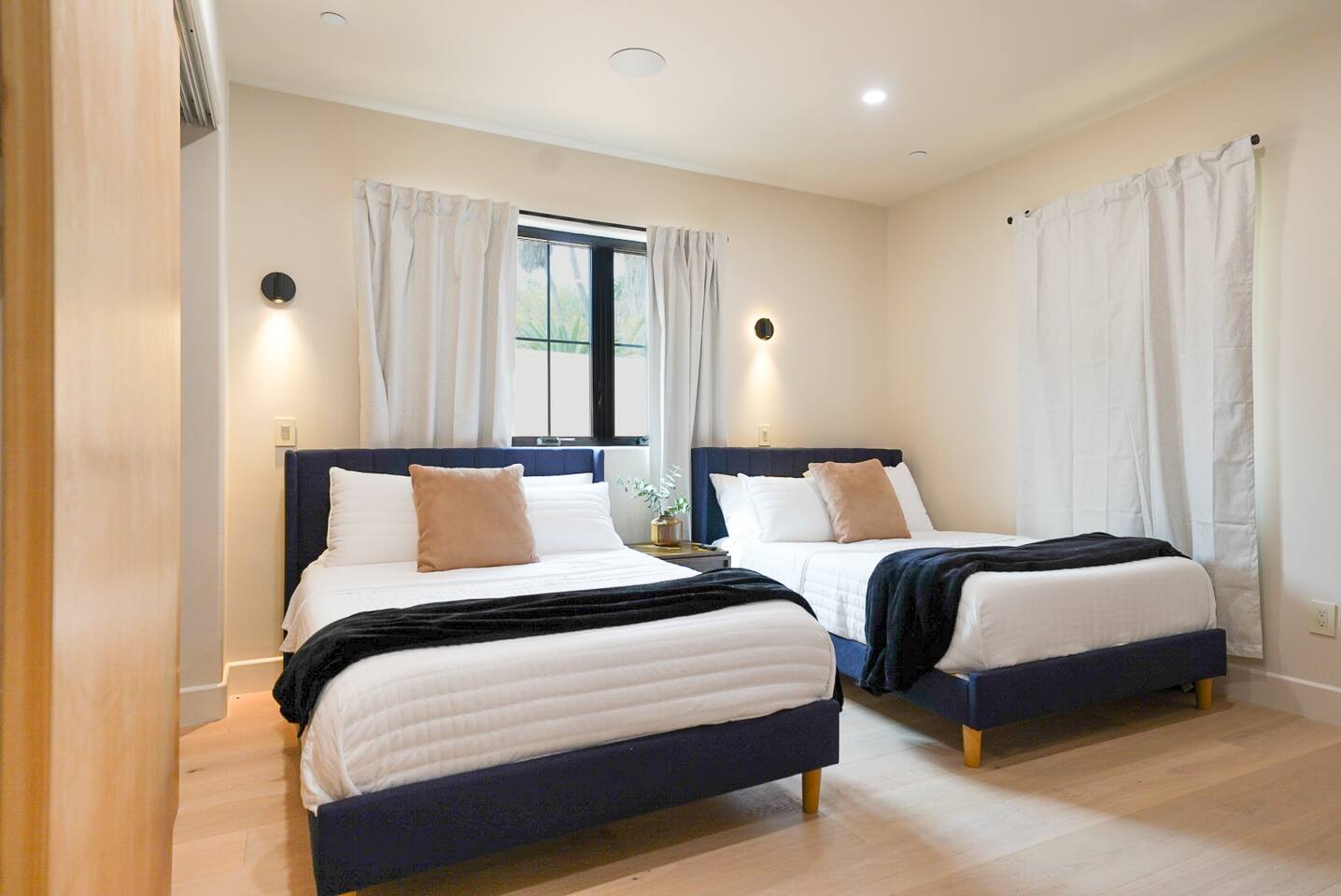 This spacious 3-level luxury home offers comfort, privacy and plenty of room for groups and families. Ground Level: Features a 2-car garage, a large open-concept kitchen, dining area and living room, a convenient half bathroom and one of the private master suites with a king bed and its own large bathroom. Lower Level: Includes a second master suite with a king bed, plus two very large bedrooms each furnished with two full beds. These bedrooms share a spacious Jack & Jill full bathroom. Top Level: The open rooftop terrace is perfect for relaxing and enjoying the views. Outdoor Space: The backyard includes comfortable seating and lounge furniture, ideal for enjoying Southern California weather. Sleeping Arrangements: • 2 King beds (master suites) • 4 Full beds (two bedrooms with two beds each) • 1 Queen sleeper sofa (living room) This layout makes the home perfect for large families, groups or guests traveling together who still want privacy and space.